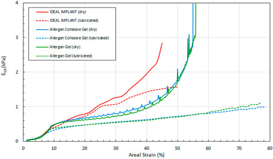 Several observations can be made regarding the tangent moduli trends of Figure 14, Figure 15 and Figure 16. First, at low strain and for both dry and lubricated platens, the tangent moduli for the IDEAL IMPLANT are similar to both gel implants. However, the projection, diametric and areal tangent moduli for the IDEAL IMPLANT diverge to higher values from the gel implants at about 25%, 12% and 14% strain, respectively, for dry platens, and at about 25%, 10% and 10% strain, respectively, for lubricated platens. This indicates that above these low strain values, the IDEAL IMPLANT is more shape stable than the cohesive gel and gel implants. For example, at 40% projection strain the IDEAL IMPLANT projection tangent modulus is about 80% and 100% higher than the gel implants for dry and lubricated platens, respectively. At 20% diametric strain, the IDEAL IMPLANT diametric tangent modulus is about 60% and 100% higher than the gel implants for dry and lubricated platens, respectively. And, at 40% areal strain, the IDEAL IMPLANT areal tangent modulus is about 80% and 130% higher than the gel implants for dry and lubricated platens, respectively. These differences in moduli increase even more at higher strain values, and are remarkable especially since the IDEAL IMPLANT is filled with an inviscid fluid rather than silicone gel.