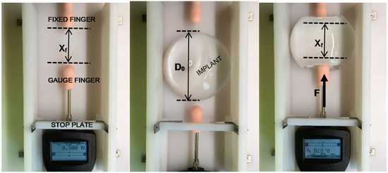 Pre-defined “stops” controlled by an adjustable stop plate limit the final position of the force gauge with attached finger, thereby defining a repeatable final squeeze or pinch distance, or distance between the fingers Xf. The movable gauge and attached gauge finger are retracted and an implant is placed between the two silicone fingers. The movable gauge finger is then pushed into the implant and the implant slides into the fixed finger. By this simple test, the implant projection is not confined, so when the implant is diametrically squeezed or pinched, it is free to deform naturally in all directions in response to the localized compressive load. Figure 17 also shows a pinched implant using this method. The pinch force F is recorded as a function of final pinch distance, Xf, and the test is repeated a total of 30 times for each implant and each Xf. Curves were then generated for the three implants for the series of Xf values. A localized diametric strain, ϵLD, can be defined from the initial implant diameter Do and the final pinch distance Xf as: