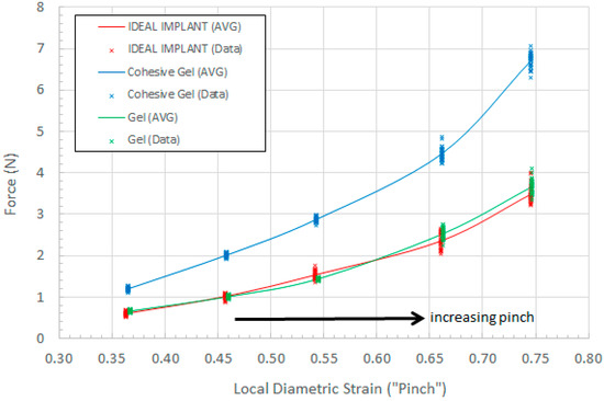 Lastly, a simple experimental study was conducted to better understand the mechanical response of an implant to a localized lateral compressive force across the implant diameter, such as pinching or grasping the implant at the perimeter. This differs from the total implant response to compressive loads, since the implant is not confined by platens and is able to move and respond freely to the lateral compressive load. This testing was meant to provide additional quantitative information about the strain response when an implant is diametrically pinched at the perimeter by finger tips at low loads. This type of localized strain entails relatively low forces of about 8 N or less and is related to implant tactility or palpability. These tests were conducted using a Torbal FC10 (Scientific Industries, Inc., Bohemia, NY, USA) 10 N push-pull digital force gauge configured with a simulated silicone finger.