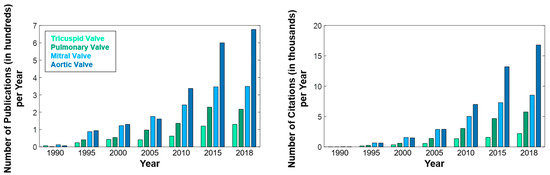 The number of publications (left) and the number of total citations (right) since 1990 for the four heart valves. Data was adopted from the Web of Science.