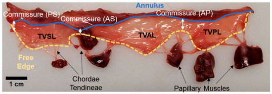 An excised porcine TV tissue sample, showing the three tricuspid valve leaflets, papillary muscle, chordae tendineae, commissures, and the TV annulus.
