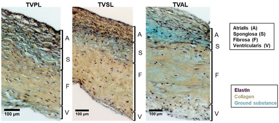 The TV annulus transitions into three leaflets: the TVAL, TVPL, and TVSL (Figure 2). In general, the TV leaflets have a rough zone in the crescentic region where chordae tendineae are attached, a broad basal zone at the apex of the leaflet, and a clear zone [45]. Our recent examination of the porcine valves leaflets demonstrated that the TV leaflets are more translucent and thinner than their MV counterparts as a result of fewer collagen proteins [46]. Histological analysis also revealed the difference in the layered structure between the TV and MV leaflets (cf. Figure 10 from Jett et al. [46]). The TV leaflet tissue layers are composed of extracellular matrix proteins—elastin, collagen, proteoglycans (PGs), and glycosaminoglycans (GAGs) populated with dynamic valvular interstitial cells (VICs). The connective tissue structure is organized into four morphologically and biomechanically distinct layers known as the atrialis (A), spongiosa (S), fibrosa (F), and ventricularis (V) (Figure 3) [47,48].