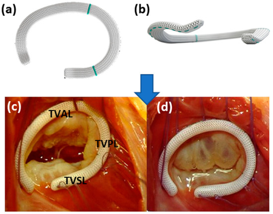 (a) Edwards physio-partial annuloplasty ring (b) mimics the three-dimensional geometry of the TV annulus. (c) The implanted annuloplasty ring is shown during diastole, and (d) systole. Images were modified from [92].