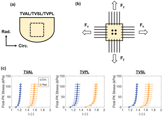 (a) Schematic of the excised leaflet tissue and the central bulk region taken from the TVAL, TVPL, or TVSL. (b) An illustration of the mounted TV leaflet tissue specimen onto the biaxial testing system with the collagen fiber orientations (circumferential and radial directions) aligned with the testing x- and y-directions. (c) Mean ± SEM of the first-PK stress versus stretch results of the porcine TVAL, TVPL, and TVSL tissues (n = 6) under equibiaxial loading protocol (Fx:Fy = 1:1) at room temperature (22 °C). Images were modified from Jett et al. (2018) [46].