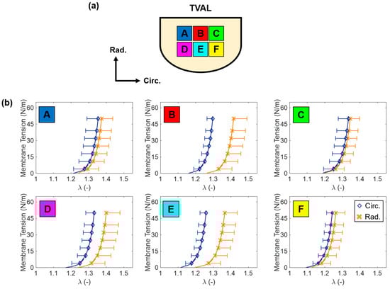 Previous studies have elucidated the leaflet tissue’s mechanical properties by performing biaxial mechanical testing of the central, belly regions of the TV leaflets (Figure 8a,b) [46,116,121,122,123]. Because of the complex microstructure of the fibrous tissues, biaxial mechanical testing is generally performed at various loading ratios of a targeted stress in each tissue direction (i.e., circumferential and radial directions). Coupling between the two tissue directions plays a critical role in the overall stress-stretch responses. Moreover, the TV leaflet tissues exhibit repeatable cyclic mechanical response after the tissue has been preconditioned to restore their in-vivo functionality.