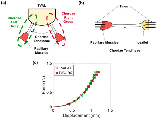 The chordae tendineae are fibrous strings that originate from the ventricular papillary muscles or from the ventricle wall and transmit tensile force to the leaflets (Figure 2). The chordae split into three segments either soon after their origin or just before their attachment to the leaflets or the commissural region [54]. Chordae tendineae are composed of elastin, GAGs, collagen fibers, and endothelial cells [55]. The chordae tendineae are typically categorized as basal, marginal, strut, or commissural based on their leaflet attachment location [54,56]. Each category is associated with varying length, cross-sectional area, and mechanical properties of the chordae tendineae. For example, the marginal chordae that are connected to the free edges of the leaflets are stiffer than the basal chordae that are attached to the TV annulus [57].
