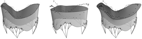 - Labrosse, M.R.; Beller, C.J.; Robicsek, F.; Thubrikar, M.J. Geometric modeling of functional trileaflet aortic valves: Development and clinical applications. J. Biomech. 2006, 39, 2665–2672. [Google Scholar] [CrossRef] [PubMed]