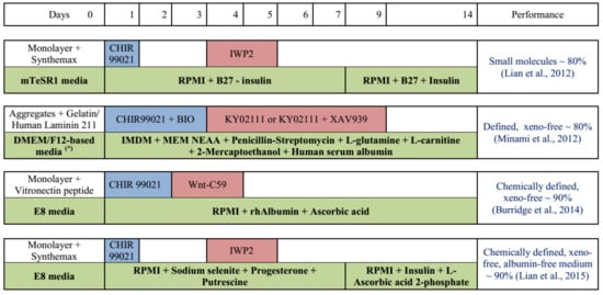 - Lian, X.; Hsiao, C.; Wilson, G.; Zhu, K.; Hazeltine, L.B.; Azarin, S.M.; Raval, K.K.; Zhang, J.; Kamp, T.J.; Palecek, S.P. Robust cardiomyocyte differentiation from human pluripotent stem cells via temporal modulation of canonical Wnt signaling. Proc. Natl. Acad. Sci. USA 2012, 109, E1848–E1857. [Google Scholar] [CrossRef]