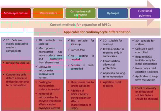 For transplantation, it may be adequate to use numerous immature cardiomyocytes. To date, the efficient methods for cardiomyocyte differentiation from large-scale expansion of hPSCs may include culturing hiPSC as 3D aggregates and hydrogel application to form a 3D structure. For avoiding cellular damage caused by shear stress in the production, encapsulation by hydrogels or macroporous microcarrier will be efficient [,]. Applying hiPSC as 3D aggregates independent from the ROCK inhibitor is ideal; however, 3D aggregates along with the ROCK inhibitor is also favorable for cell commitment toward mesendoderm lineage including cardiomyocytes [,]. For hPSC expansion and cardiac differentiation in suspension with size-controlled aggregates without depending on carrier and agitation, application of functional polymers as proposed by Otsuji et al. [] is recommended although the system needs to be improved on oxygen supply in large reactor for industrial-scale cell production. While further studies to examine the effect of viscosity on diffusion of soluble factors are necessary, application of functional polymers for hPSC culture may serve as a future prospect for hPSC expansion at industrial scale and cardiomyocyte differentiation (Figure 2).