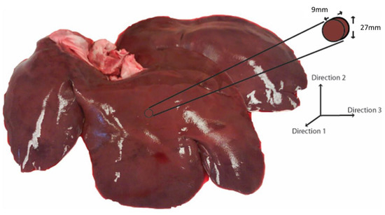 Porcine livers from healthy adult pigs were obtained from a local abattoir (age range: 6–9 months; weight range: 250–350 lbs.; sex: male). The specimens were stored in phosphate-buffered saline (PBS) (Sigma-Aldrich, St. Louis, MO, USA) at 4 °C soon after extraction and were transported to the laboratory. All testing was performed within 12 h of extraction. For PSHPB application, the tissue sample was carefully extracted to maintain a certain shape and size. A bar diameter larger than the sample size was important to ensure that most of the energy was transmitted through the sample [11]. Testing was performed on samples with aspect ratios ranging from 1:1 to 3:1, and it was determined that an aspect ratio of 3:1 produced consistent data (results not shown). Thus, a cylindrical die of 30 mm inner diameter was used to cut disc-shaped samples to approximately 27 mm in diameter and 9 mm thick for an aspect ratio of 3:1 (Figure 1). The aspect ratio and size corresponded well with previous studies [11,22]. In order to extract samples in different directions, a 9 mm slice was cut in the appropriate direction, laid on its side, and then punched out with the cylindrical die. The axis of the disc-shaped sample was aligned along one of the three orthogonal directions.