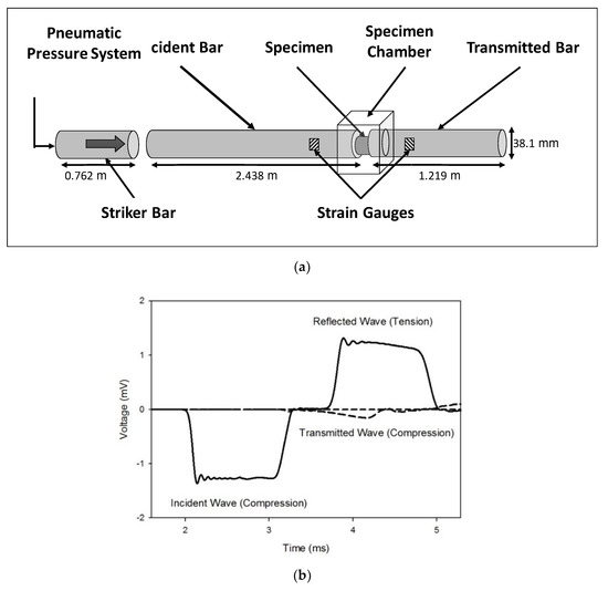 As the striker bar impacted the incident bar, a compressive wave (incident wave) was generated and propagated down the incident bar where it reached the specimen, which caused compression of the specimen. At this point, a portion of the wave was reflected back into the incident bar as a tensile wave (reflected wave). The remainder of the compressive wave (transmitted wave) was transmitted through the specimen and into the transmitted bar (Figure 2b). The incident, reflected, and transmitted waves were measured by two strain gauges—one gauge on both the incident and transmitted bars. The PSHPB experimental setup was based on the following assumptions: (i) the specimen undergoes uniform and uniaxial stress during deformation; (ii) the incident and transmitted bars are elastic; (iii) the edges of the bars in contact with the specimen remain flat and parallel; (iv) the incident, transmitted, and reflected waves undergo minimal dispersion as they travel along the bars; and (v) strains measured at the surface of the bars are indicative of those throughout the cross-section [26]. The theory behind the SHPB setup and the constitutive true stress–strain relationship of the sample deformation is briefly discussed in Appendix A. The experimental setup also included a laser speed meter for monitoring the incident bar speed and DAQ modules for data acquisition. Data were processed via DAVID Viscoelastic Software [18].