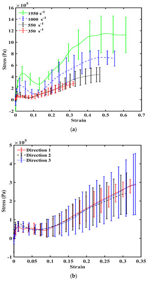 PSHPB experiments showed that liver tissue had a strain rate-sensitive behavior under high-rate compression (Figure 3a). Stresses were significantly higher as the strain rate increased from 350, 550, 1000, to 1550 s−1. The resulting stress–strain behavior showed that the liver tissue exhibited an initial stiffening behavior, which was followed by softening. After softening, tissue hardening took place until yielding and ultimate failure. The nonmonotonic stress–strain behavior described above was apparent for all four strain rates (350, 550, 1000, and 1550 s−1).