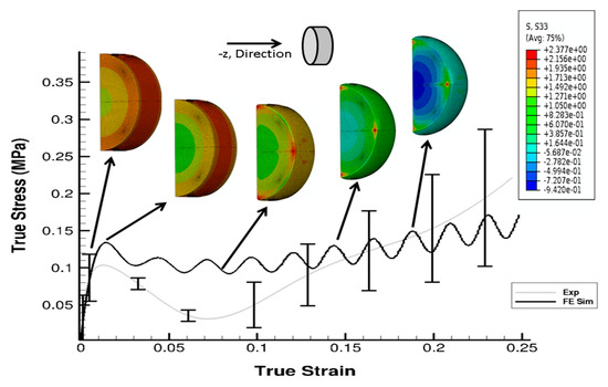 As observed in Figure 6 and Figure 7, the high-frequency oscillatory behavior of the FE simulation stress–strain response was higher than that of the experimental response. The experiment, which represented more of a real-world scenario, encountered the lower levels of such high-frequency oscillations. In real life experimental systems, energy dissipation mechanisms act as a damping source, but in an FE model, which is an undamped system simulating a real world damped experimental system, proportional damping is commonly used to account for dissipative mechanisms (Appendix B).