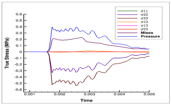 Plot of pressure, von Mises, and stress from different orthogonal directions (σ11, σ22, σ33, σ12, σ13, and σ23) over time, obtained from the FE simulation at 550 s−1. Compressive stresses are negative.