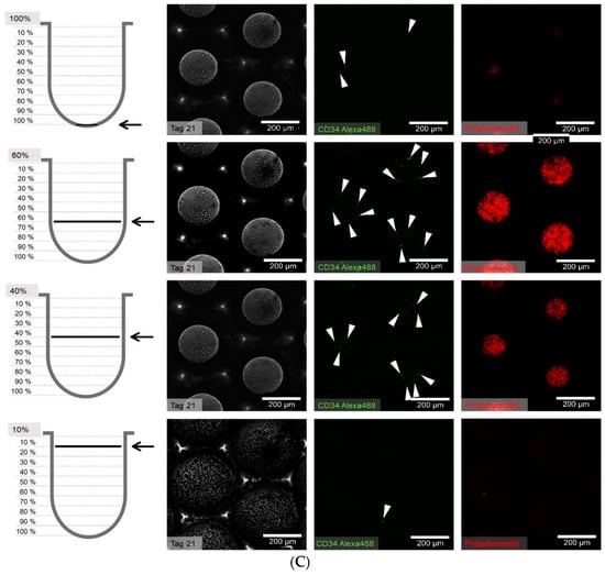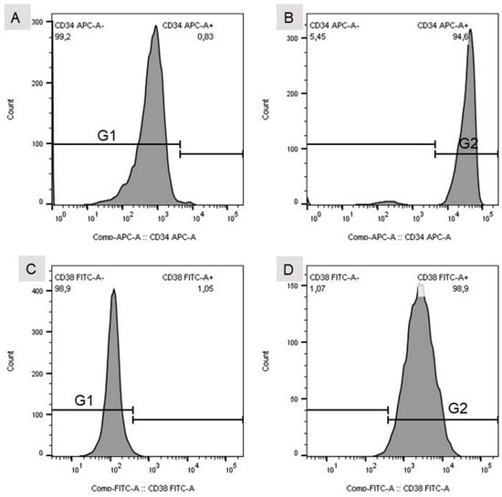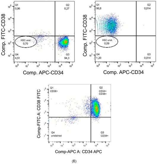 At 1 to 21 days after seeding, the cells in the wells were carefully washed once with phosphate buffered saline (PBS) and subsequently fixed with 4% paraformaldehyde (PFA) for 15 min at room temperature. To stain for intracellular proteins, a permeabilization step with 0.2% Triton X-100 was performed. The following combinations of primary and secondary antibodies were used for indirect immunofluorescence staining: CD34 (CD34 mouse anti-human, (4H11(APG)), 10 µg/mL, ab762, Abcam, Bertha-Benz-Straße 5, Berlin, Germany) and goat-anti-mouse-Alexa Fluor 488 (AC-11001, ThermoFisher Scientific, 168 Third Avenue, Waltham, MA, USA) were used. In cases with propidium iodide counterstaining, a goat-anti-mouse-fluorescein isothiocyanate (FITC) conjugated antibody (62-6511, goat anti-mouse IgG (H+L) secondary antibody-FITC, ThermoFisher Scientific, 168 Third Avenue, Waltham, MA, USA) in combination with the primary antibody against CD34 (ab762) was used. For direct immunofluorescent staining and flow cytometry, a CD34 antibody labelled with allophycocyanine ((APC), CD34 mouse anti-human-APC (AC136-APC, ThermoFisher Scientific, 168 Third Avenue, Waltham, MA, USA) and a CD38 antibody labeled with FITC (CD38 Monoclonal Antibody (HIT2), 11-0389-42, FITC, eBioscience™, ThermoFisher Scientific, 168 Third Avenue, Waltham, MA, USA) were used.