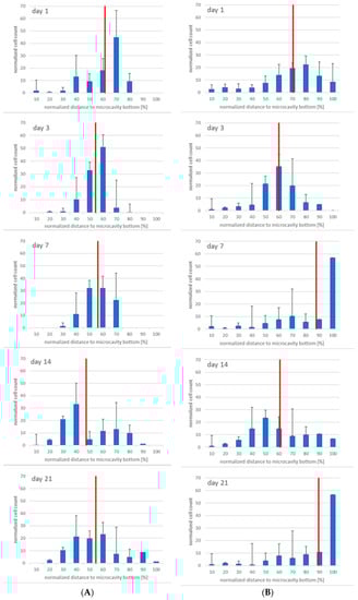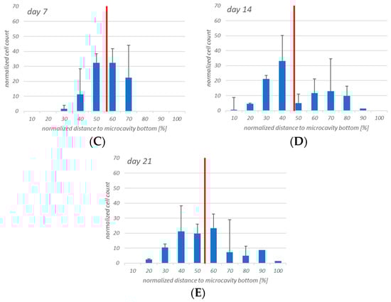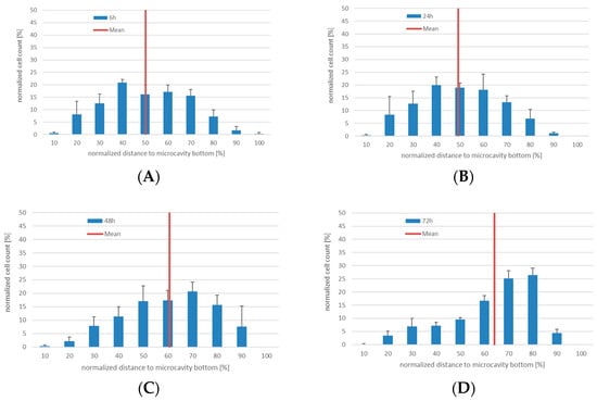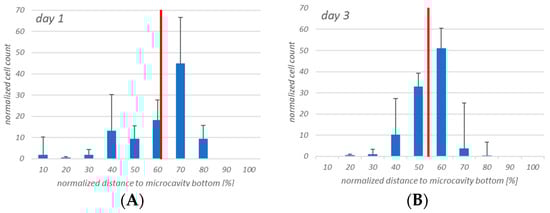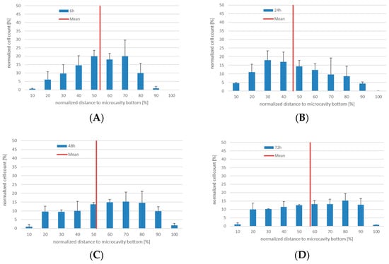 Z-coordinates of the counted objects were normalized to the depth of the microcavity. Because the depth of the microcavities can slightly vary from microcavity array (MCA) to microcavity array, whole depth was set to 100% and was divided into ten classes with equal step size (see