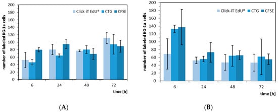 17], it can be assumed that KG-1a showed a more pronounced migration behavior in the hMSC co-culture. However, since the proliferation behavior of KG-1a cells in the hMSC environment shows a trend to decrease, even though the migratory behavior was more pronounced, apoptosis may have led to increased cell death in this setup and this will be accounted for in the next experimental series.