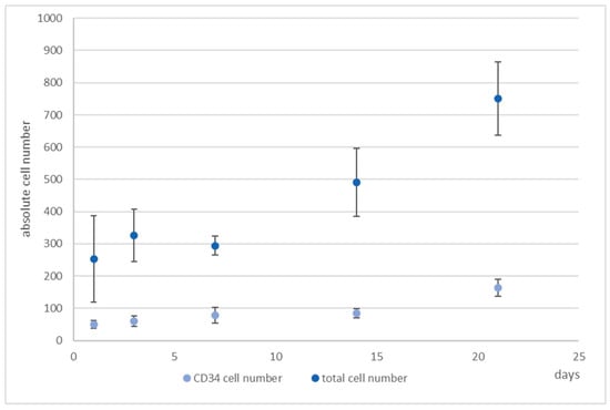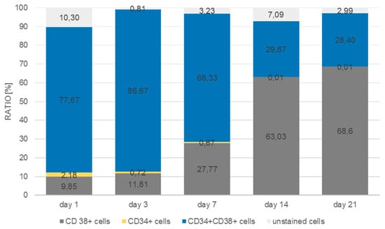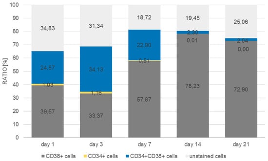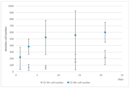 The antibody staining of the CD34 and CD38-positive cells showed inconsistent results: The distribution of the CD34 and CD38-positive cells was more or less the same at days 1, 3, and 14, whereas at day 7 and 21 CD38