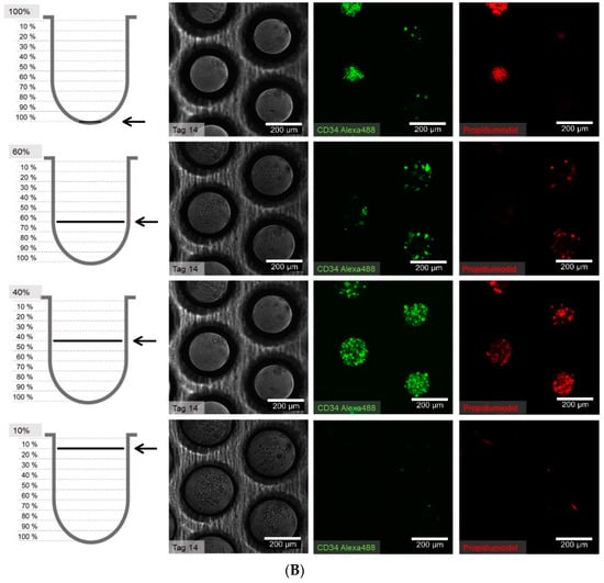 17] proposed a dynamic niche model based on a microcavity array, consisting of a polymer film chip containing 634 microcavities (diameter of 300 µm) on an area of 10 × 10 mm and with outer measures of 20 × 20 mm. The chip was placed inside a microbioreactor that was actively super fused with medium, and was shown to largely maintain CD34-expression over time. Other microcavity models used much smaller diameters for single cell approaches that were based on polydimethylsiloxane (PDMS) [