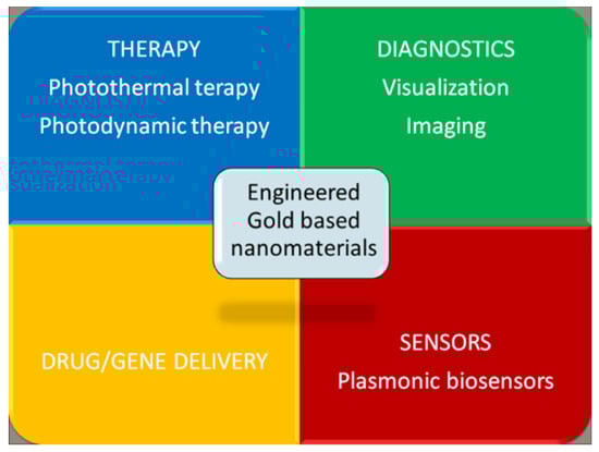 A schematic representation of the four main areas of biomedical applications for engineered gold-based nanomaterials.