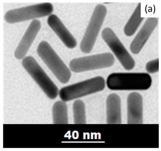 Regarding the mechanism of AuNRs formation, the discussion is open: a general mechanistic model has not yet been found, although it would be very helpful for defining a synthetic pathway for each nanostructure. AuNRs synthesis includes both thermodynamic and kinetic controls, which increase the parameters number that should be taken into account. In fact, a spherical nanoparticle can be defined only by the average diameter, while the AuNRs’ description involves the aspect ratio, the length, the thickness, the shape yield and the reduction yield. A high control degree of the growth process is necessary, especially when the aim is an accurate control of AuNRs’ aspect ratio. The TEM images of AuNRs are reported in Figure 4. Among several technique to prepare AuNRs, the most diffuse is the seed-mediated colloidal growth methods, where nucleation is achieved separately and the seeds are successively added to the nanorod growth solution. This synthetic procedure does not require specialized equipment, and it has straightforward scalability: important requirements for a clinical translation. It is worth mentioning that there are some methods called “seedless” but that they are commonly characterized by a lower reproducibility and high polydispersity.