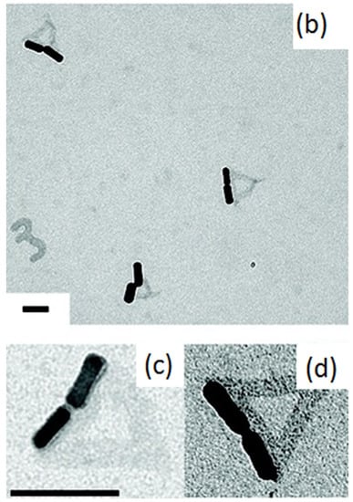 The anisotropy of AuNCs allows for improved signals based on the local field enhancement at the tips and corners. The TEM images of the AuNCs are reported in Figure 5c,d. Many efforts were done in the new AuNCs designs, in view of the different aims and applications, but a fine regulation is still necessary regarding the quality and reproducibility []. The synthesis of AuNCs is commonly considered to be difficult, since the cubes are confined by six closed 100-planes, requiring precise growth settings for their formation. The variations of the experimental parameters, such as the precursor concentrations, mixing conditions, temperature and reaction time, can lead to different results [].
