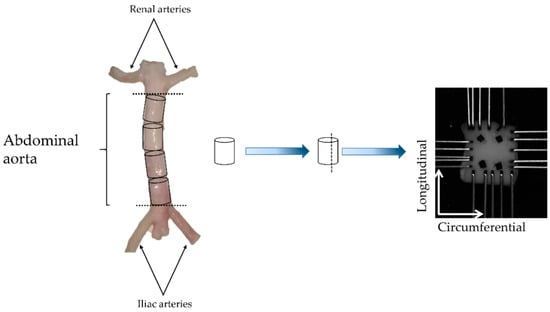 Exemplary schematic for specimen procurement. Each specimen consisted of a cylindrical ring approximately 7 mm long, which were subject to planar biaxial tensile testing. N = 6 specimens per group were tested using a CellScale BioTester® while submerging the specimen in saline solution at 37 °C.