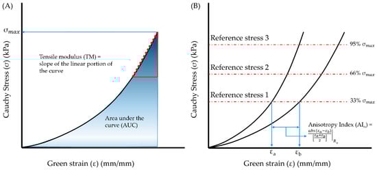The tensile moduli (TM), defined as the slope of the upper linear portion of the stress–strain curves that best represents the linear elastic region of the material (see Figure 2A) for the circumferential and longitudinal directions, were calculated using a pointwise linear regression in the upper 10% of the strain range. The strain energy, determined by area under the stress–strain curve (AUC), and maximum stress () were also calculated for both tissue orientations (see Figure 2A).