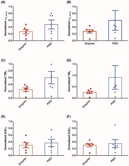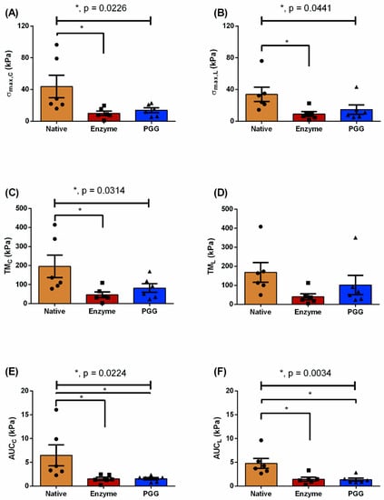 Data were reported as mean ± standard error of mean (SEM). The same porcine arterial specimens (N) underwent enzymatic treatment (E) and followed by PGG treatment (P), a repeated-measures ANOVA was performed to elucidate the differences across the biomechanical data (, TM, , and AUC). Sphericity was assumed for the data and pairwise comparisons were performed using Tukey’s test with results considered significant when p < 0.05. All analyses were performed using SPSS (IBM Corp., Armonk, NY, USA).