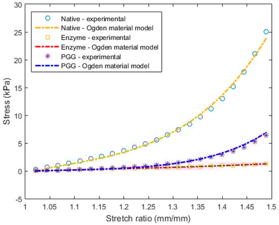 Ogden model fitting with the corresponding experimental stress–strain curves for an exemplary specimen of the native (N), enzyme (E), and PGG treatment (P) groups.