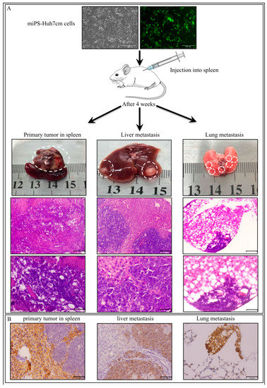 3.2.1. miPS-Huh7cm Cells Metastasized to Liver and Lung