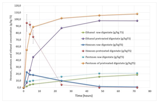 Bioethanol production was tested on the dry SS-DIG at the 30 min VBM conditions that led to the best level of cellulose hydrolysis (Figure 2 and Table 3). Bioethanol on raw digestate led to a low ethanol yield of 19 geth kg−1 TS corresponding to only 17% of the theoretical value, as shown in Figure 3. VBM of dry SS-DIG for 30 min led to an enhancement of the ethanol yield, with 98 geth kg−1 TS, corresponding to 90% of the theoretical value. Lower yields were reported by Ref. [], with an ethanol yield of 37 geth kg−1 TS with dry SS-DIG that was mechanically pretreated (centrifugal milling). Other studies have demonstrated the benefit of pretreated SS-DIG to improve bioethanol production [,]. For instance, thermo-alkaline pretreatment has led to bioethanol recoveries from solid digestate of 75% to 80% compared to the theoretical value [,]. In future studies, it would be interesting to test other strains or bacteria capable of producing bioethanol from C5 sugar sources to improve bioethanol recovery from SS-DIG hydrolysate, as C5 sugars were not consumed in the present assay, as shown in Figure 3.