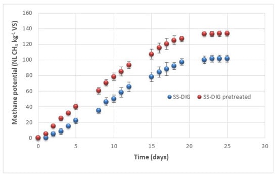 Treated and untreated SS-DIG were digested in batch mesophilic anaerobic flasks. The volume of each flask was 1 L, with a working volume of 600 mL, the remaining 400 mL volume serving as headspace. SS-DIG and SS-DIG pretreated were introduced into the flasks with the inoculum ata substrate to inoculum ratio of 0.5 g VS/g VS. The inoculum was an inoculum acclimated in our laboratory with a feed composed of wastewater sludge and grasses. The inoculum contained 34 g/L total solids (TS) and 23 g/L volatile solids (VS). Once the flasks were prepared, degasification with nitrogen was carried out to obtain anaerobic conditions and the bottles were closed. Triplicate bottles were incubated at 35 °C. Assays with only inoculum were performed also in triplicate as blank control in the same condition. Biogas volume was monitored by pressure measurement using a manometer (Digitron 2023P, Digital Instrumentation Ltd., Corby, UK). Biogas composition was determined using a gas chromatograph (Varian GC-CP4900, Agilent, Ratingen, Germany) equipped with two columns: the first (Molsieve 5A PLOT, Agilent, Ratingen, Germany) was used at 110 °C to separate O2, N2 and CH4, the second (HayeSep A, Agilent, Ratingen, Germany) was used at 70 °C to separate CO2 from other gases. The injector temperature was 110 °C and the detector was 55 °C. The detection of gaseous compounds was done using a thermal conductivity detector. The calibration was carried out with two standard gasses composed of 35% CO2, 5% O2, 20% N2 and 40% CH4 for the first one and 9.5% CO2, 0.5% O2, 80% N2 and 10% CH4 for the second one (special gas Air Liquide®, Paris, France). All the results were expressed as biogas volume produced at normal conditions (in NL at 0 °C, 1013 hPa).