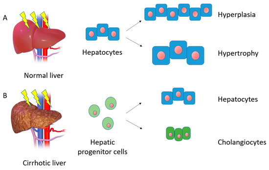 Schematic representation of mechanisms of liver regeneration. (A) After liver damage in normal conditions, the principal ways to restore hepatic mass are hyperplasia and hypertrophy. (B) In the cirrhotic liver, the normal regeneration process is impaired and hepatic progenitor cells are involved in restoring liver functions.