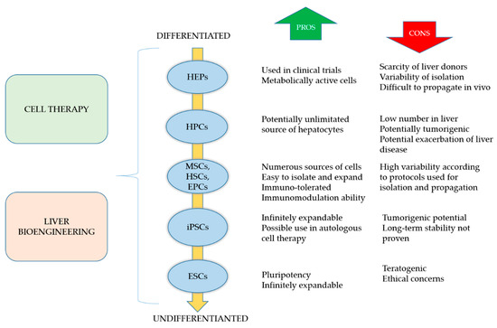 Schematic representation of the principal cell sources available for cell therapy and liver bioengineering, with brief description of their pros and cons. HEPs: hepatocytes; HPCs: hepatic progenitor cells; MSCs: mesenchymal stem cells; HSCs: hematopoietic stem cells; EPCs: endothelial progenitors cells; iPSCs: induced pluripotent stem cells; ESCs: embryonic stem cells.