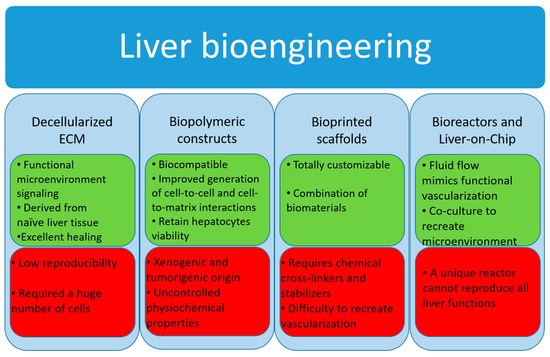 Main pros (green boxes) and cons (red boxes) of the principal liver bioengineering approaches. ECM: extracellular matrix.