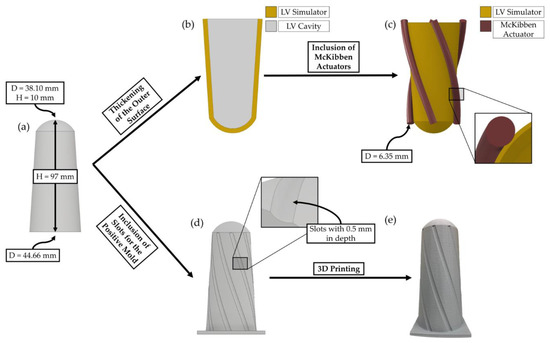 A positive mold was generated out of the LV cavity. First, separate sets of coordinate files were generated. Similar to the actuator coordinates, mold coordinates also had an offset to mimic the simulator, therefore slots were created on the mold geometry to provide guides for actuator orientation during manufacturing. A base plate was added to the mold geometry that provides a stable surface during manufacturing (Figure 2d). Finally, generated mold geometry was 3D printed with PLA (Figure 2e).
