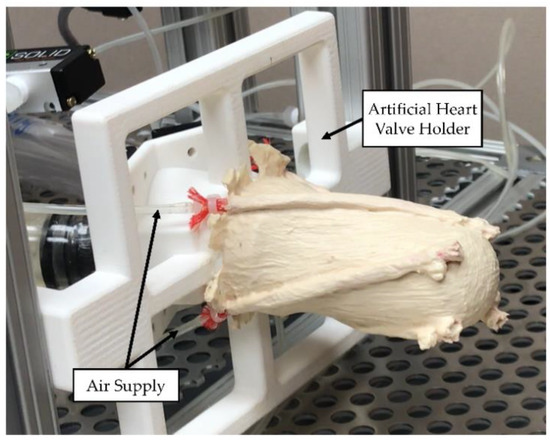 LV simulator was connected to the artificial heart valve holder (Figure 5). Each McKibben actuator was connected to the air source and loaded with 550 kPa. While directional deformation of the apex and the rotation of the apex were measured, surface deformations were observed on the LV simulator.