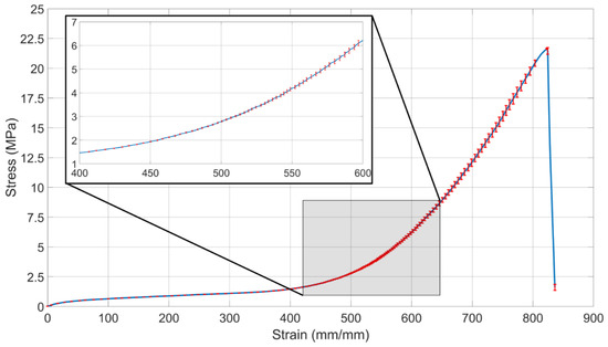 Stress-strain curve of the latex rubber. The blue line indicates the average of three tests and the error bars represent the standard error. The shaded area is magnified to show 400 mm/mm to 600 mm/mm strain range clearly.