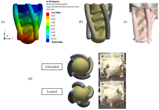 (a) Contour bands of the directional deformation along the y-axis. The positive y-axis is located on the upward direction; (b) Deformed FE model; (c) Deformed LV simulator prototype; (d) Before and after loading states of the model and the experiment from the apical view. Similar deformation mechanics were observed on the model and the experiment.