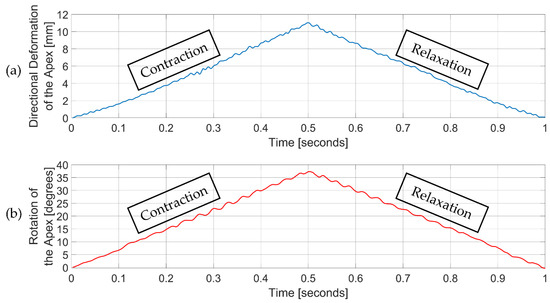 Time change of directional deformation and rotation of the apex over one beating. Actuators were loaded from 0 to 0.5 s and unloaded from 0.5 s to 1 s. (a) Directional deformation of the apex; (b) Rotation of the apex.