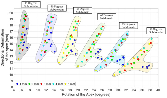 After the validation of the FE model. Design domain of the LV simulator was generated with the directional deformation of the apex and the rotation of the apex from FE models (Figure 9). Figure 9 shows that design points with the same orientation angle were located around the same individual regions in the design domain. Therefore, the design domain was divided into six subdomains with respect to the orientation angle.