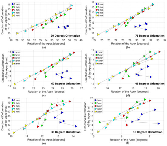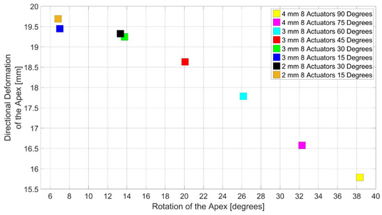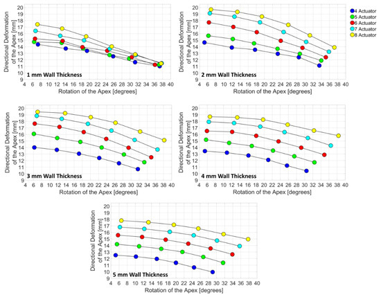 In the 45 degrees subdomain (Figure 11d), directional deformation of the 1 mm models increased by 16% with the increase in the number of actuators. Rotation decreased by 1%. Highest rotation improvement was found in 5 mm model with 8 actuators. Highest improvement of directional deformation was calculated as 43% and it was found in 3 mm, 4 mm, 5 mm models with 8 actuators. 3 mm model with 8 actuators performed best in the subdomain. In 30 (Figure 11e) and 15 degrees subdomain (Figure 11f), directional deformation increased by 22% and 21%, respectively. The rotation was decreased in both subdomains with 6% and 2%. 5 mm models showed highest improved for not only directional deformation but also rotation. The best directional deformation and the best rotation did not occur with the same wall thickness. In both subdomains, the best directional deformation was observed in 2 mm model with 8 actuators and the best rotation was observed in 3 mm model with 8 actuators.