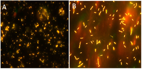 Fluorescent granules of PHA after Nile red-staining of Pseudomonas mediterranea 9.1 wild-type strain (A) and VVC1GI recombinant strain (B) grown on high-grade glycerol (≥99%) as carbon source and limited nitrogen condition after 66 h of incubation.