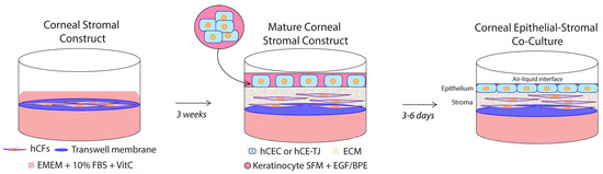 Figure 1. Schematic depicting the assembly of the corneal tissue co-culture system. Human corneal fibroblasts (hCFs) were seeded onto a polycarbonate transwell membrane followed by incubation in 0.5 mM Vitamin C-supplemented complete fibroblast media (Eagle’s Minimum Essential Medium (EMEM) + 10% fetal bovine serum (FBS) + 1X antibiotic/antimycotic) for 3 weeks at 37 °C/5% CO2 to allow in situ extracellular matrix (ECM) deposition. Human corneal epithelial cells (hCECs) were then seeded on top of the mature stromal construct and incubated in complete epithelial media (keratinocyte serum-free media (SFM) plus epithelial growth factor (EGF) and bovine pituitary extract (BPE)) for 4 days and airlifted to an air–liquid interface for 3–6 days at 37 °C/5% CO2 with complete fibroblast media in the bottom well.