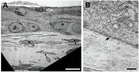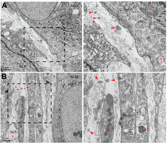 In terms of sub-cellular structure, the abundance of cytoplasmic features in hCECs and hCFs were evident, including mitochondria, lysosomes, and vacuoles (Figure 3). The presence of small vesicles (188 ± 10 nm, range 96–342 nm; arrowheads) was also identified within the extracellular space between hCECs and hCFs (Figure 3A) and between hCFs (Figure 3B). It is likely that these extracellular vesicles may play a fundamental role in cell–cell communication between the epithelium and stromal cell populations [4,30].