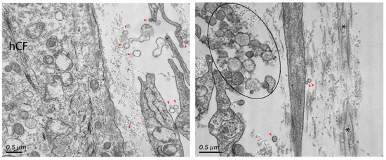 The presence of extracellular vesicles (131 ± 5 nm, range 77–228 nm) was also identified between hCFs within the stromal layer of the co-culture constructs (Figure 4, arrowheads). In particular, large vesicular bodies (300–330 nm in diameter) were apparent within the stroma near resident hCFs (Figure 4, right panel ellipse). These vesicles may be attributed as microvesicles, which are larger vesicles (up to 1 μm in diameter) formed directly from the plasma membrane. Some of these large aggregates may also be remnants of apoptotic bodies that have formed as a result of cell turnover within the stroma [31].