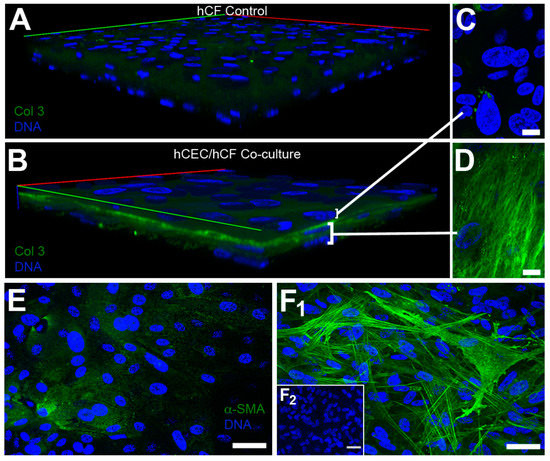 Figure 5. Expression of fibrotic markers in stromal constructs and epithelial–stromal co-cultures. Expression of collagen type III (Col 3) in (A) hCF control constructs and (B) epithelial–stromal (hCEC/hCF) co-culture. High magnification of a single plane of focus in the (C) epithelial layer and (D) stromal layer show high expression of collagen type III by hCFs and little expression by hCECs. Expression of α-smooth muscle actin in the (E) epithelial layer (max projection) and (F1) stromal layer (max projection) of a co-culture show similar high expression by hCFs with low expression by hCECs. (F2) Expression of α-smooth muscle actin in hCF control. Imaged using a 40× objective lens. Scale bar = 10 μm (C and D) and 50 μm (E and F).