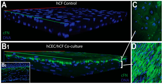 We have previously found that the wounded corneal epithelium in vivo secretes fibronectin into the anterior stroma by 3 days following a keratectomy [32]. Moreover, expression of fibronectin appears to localize at the epithelial–stromal interface and anterior stroma from 3–42 days post-keratectomy [33]. Fibronectin is known to aid in epithelial cell migration post-debridement [34], thus playing an important role in epithelial regeneration. To determine if hCECs express provisional matrix proteins in our co-culture system, we evaluated the expression and localization of fibronectin. We found that control hCFs expressed little to no fibronectin in vitro (Figure 6A). In co-cultures, fibronectin expression appeared to localize to the epithelial–stromal interface, primarily at the anterior side of the stromal layer (Figure 6B–D). This expression pattern was similar to that observed following a keratectomy in vivo [32,35] (Figure 6B2). We also examined fibronectin expression in immortalized epithelial cells (hCE-TJ) in 3-day post-airlift co-cultures, and found that hCFs did not appear to express fibronectin; however, the majority of fibronectin was likely derived from the hCE-TJ layer [Figure 7 and Appendix A (Table A2)].