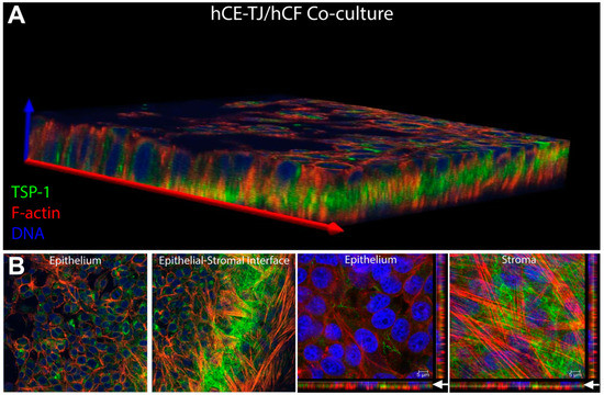 Figure 8. Thrombospondin-1 (TSP-1) expression in corneal epithelial–stromal co-cultures (hCE-TJ/hCF). (A) 3D-reconstruction of the corneal co-culture shows localization of thrombospondin-1 primarily at the epithelial–stromal interface. (B) Individual slices of the epithelial and stromal layers showed high expression within epithelial cells (left panel) and a fibrous appearance of thrombospondin-1 at the epithelial–stromal interface (right panel). Arrows (white) denote the region of the epithelial–stromal interface.